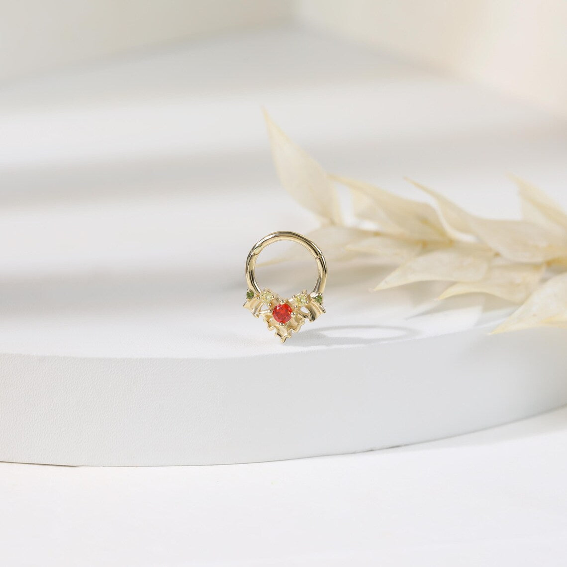 A 14K solid gold cluster-style piercing with a hinged clicker design.It can be worn in septum, nose, daith, conch, helix, and cartilage piercings, and is sized 16g.