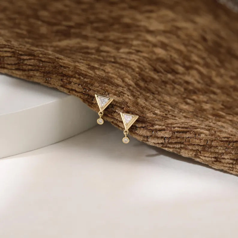 A 14K solid gold triangle dangle stud, designed for cartilage, helix, tragus, conch, nose, or labret piercings. Its tiny flat-back style makes it comfortable for daily wear and a perfect gift for her.