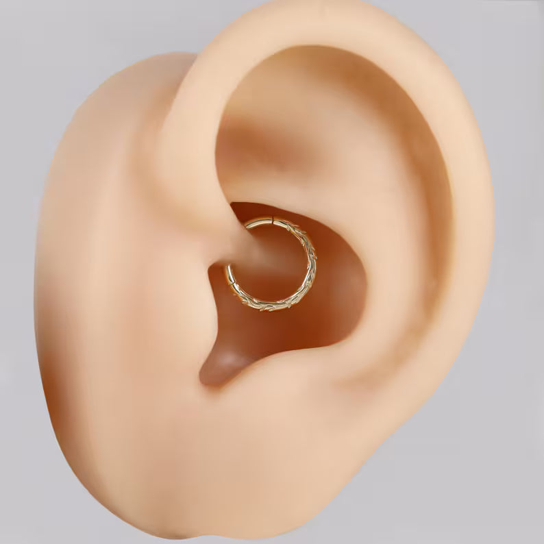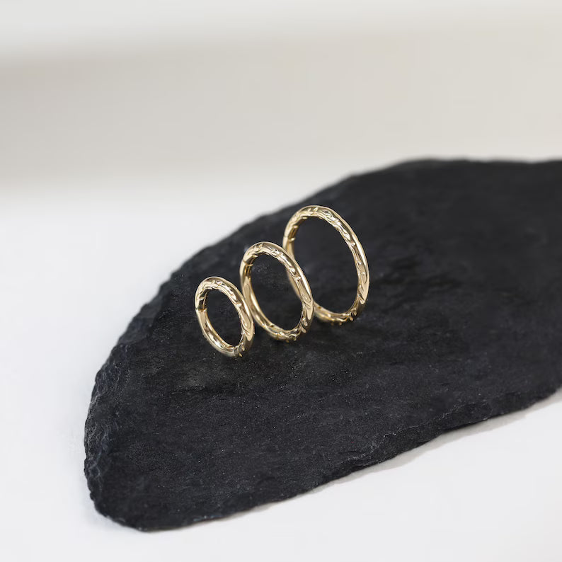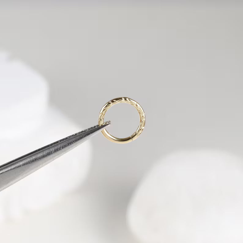A 14K solid gold braided hoop with delicate engraving.It is suitable for septum, cartilage, helix, tragus, and rook piercings, and comes in 16g thickness with 6mm, 8mm, or 10mm diameters