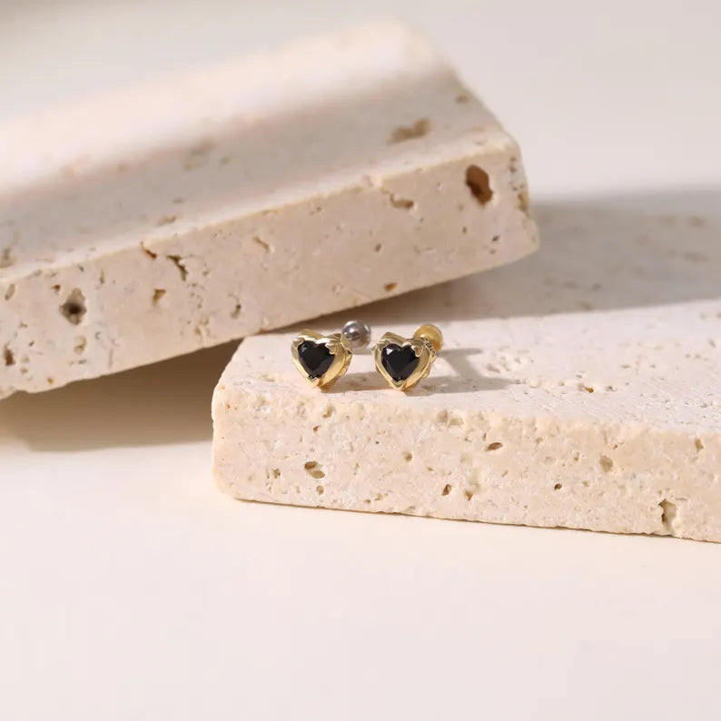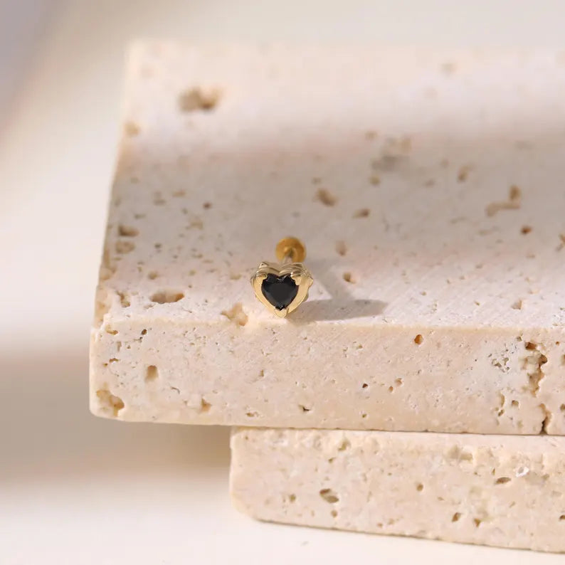 A 14K solid gold black heart stud with a threadless flat back design, suitable for cartilage, helix, conch, tragus, or nose piercings.