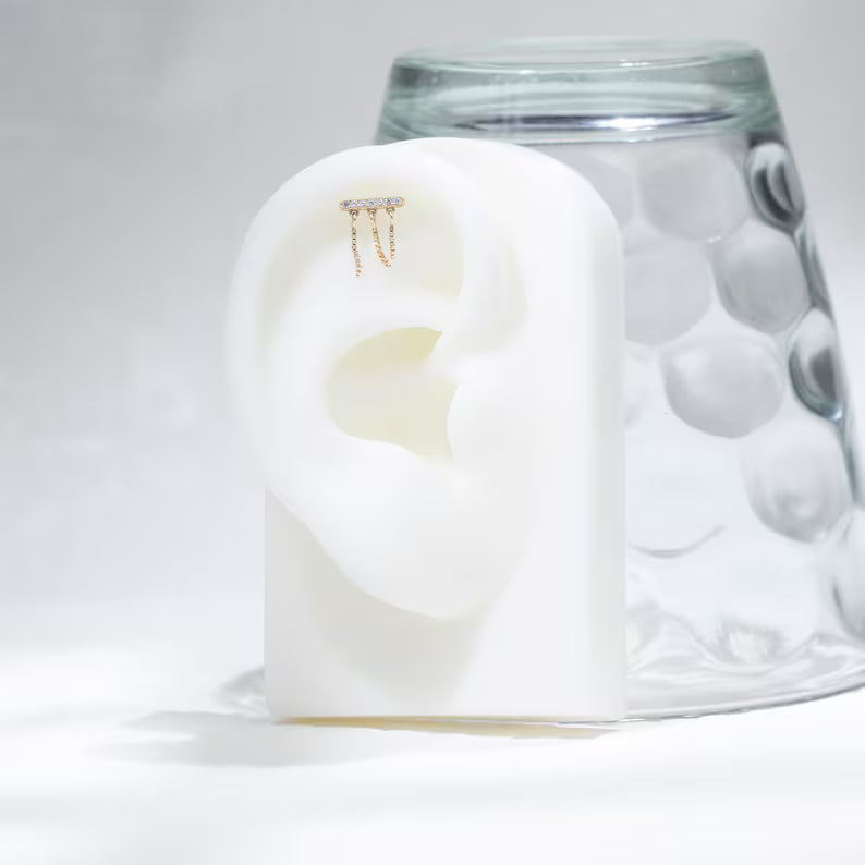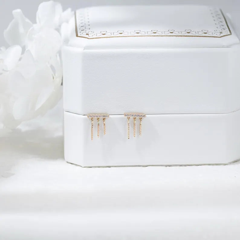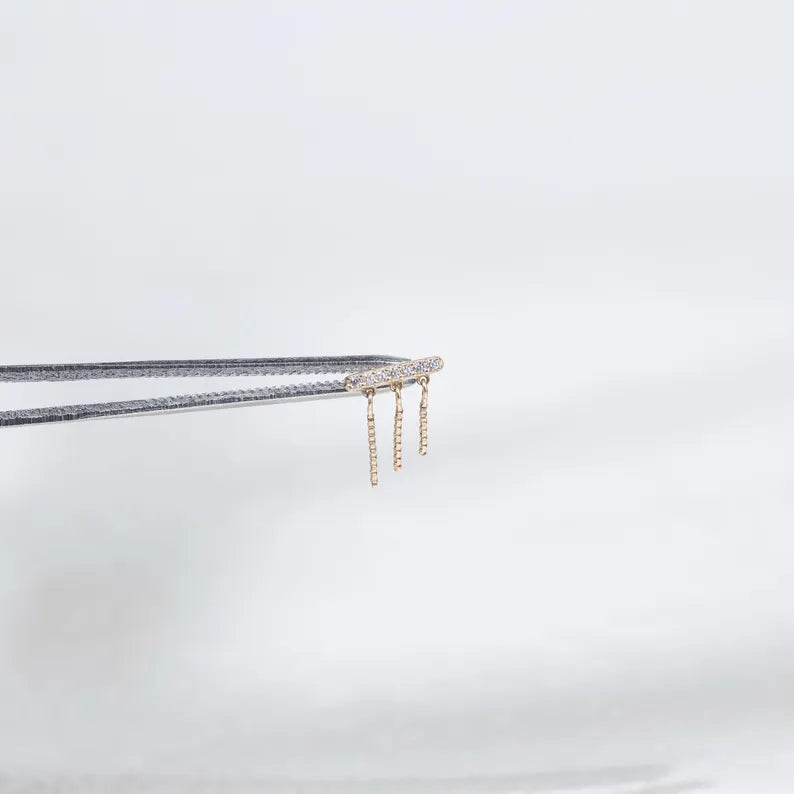 This is a 14K solid gold stud earring featuring a dangle box chain design, suitable for cartilage, forward helix, tragus, and conch piercings, dainty and comfortable with a flat back.