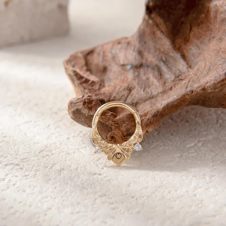 14K gold floral septum hoop with hinged clicker, perfect for septum and cartilage piercings. 16G design for elegant everyday wear.