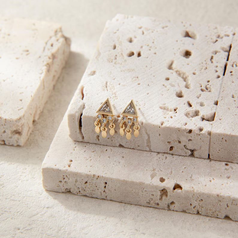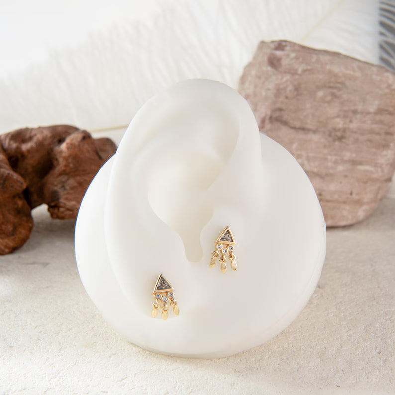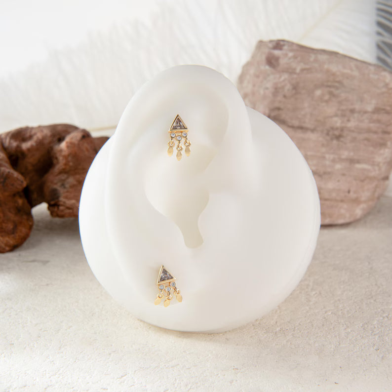 A 14K solid gold triangle dangle stud, designed for cartilage, helix, tragus, and conch piercings with a flat back threadless style.