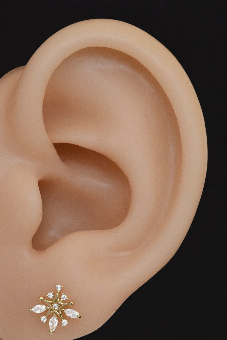 This is a 14K solid gold snowflake stud earring with a firework-inspired Elsa design, featuring a marquise shape. It's perfect for cartilage, conch, or helix piercings and has a flat push-back for comfort.