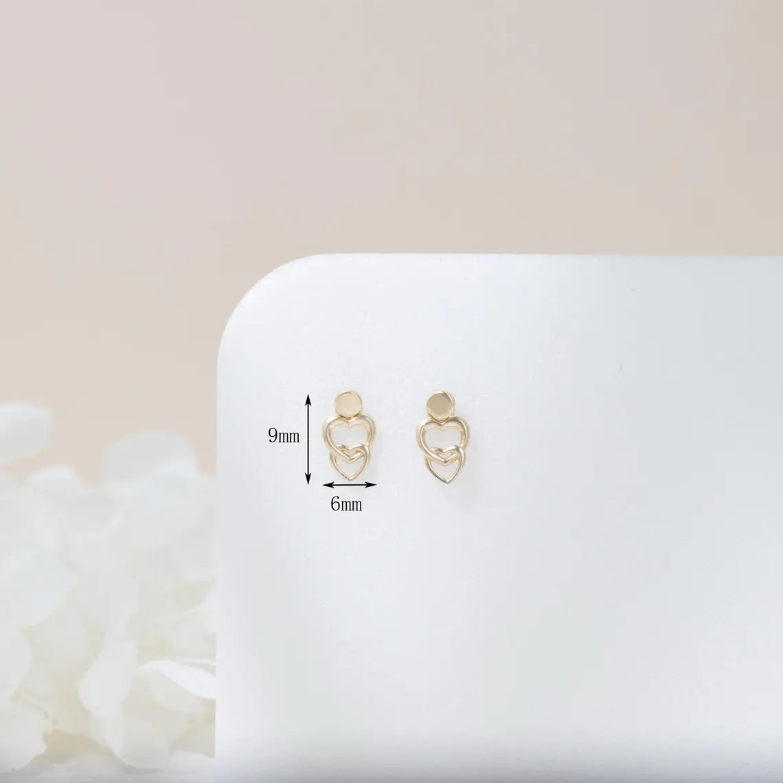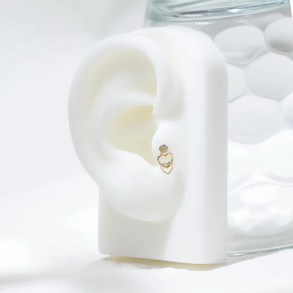 This 14k solid gold double heart charm features a minimalist design perfect for cartilage, helix, and tragus piercings. Lightweight and versatile, it makes a delicate earring charm and a meaningful gift for her.